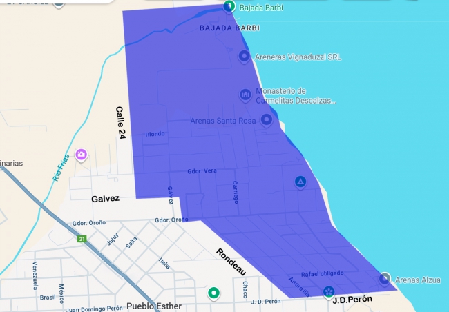 Por trabajos de mantenimiento programado, el próximo miércoles 10 de Setiembre de 07:30 a 09:00hs aproximadamente, se suspenderá el servicio de energía eléctrica en la zona comprendida por el río, Perón, Rondeau, Gdor. Gálvez y Calle 24. Según plano adjunto.